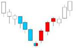 如果倒锤子线出现在下降趋势之后,则构成一个看涨的K线图形态,这一点与普通的锤子线同出一辙。在分析倒锤子线时,有一点非常重要:当倒锤子线出现后,必须等待下一个时间单位的看涨信号对它加以验证。倒锤子线的验证信号可能采取下面这样的形式:倒锤子线次日的开市价向上跳空,超过了倒锤子线的实体。向上跳空的距离越大,验证信号就越强烈。还可能采取另外一种形式:倒锤子线次日是一根白色K线,并且它的价格均处在较高的水平,则完成了看涨的验证信号。